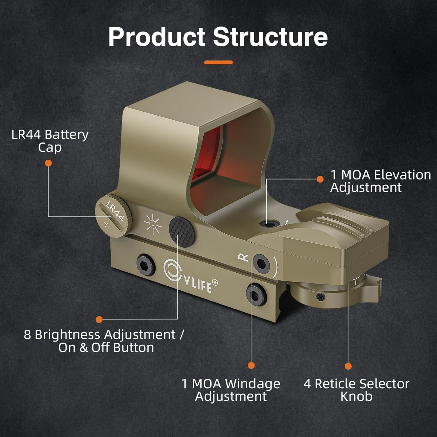 - Our red dot sight features a 40mm reflex lens aperture and four selectable reticles, providing you with a wide field of view and the ability to customize your using experience. Parallax corrected & unlimited eye-relief.