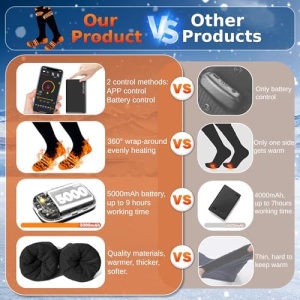 🔥【3 Heating Settings & 6 Timing Settings】First Gear (110-116°F) – 9 hours, Second Gear (129-134°F) – 7 hours, Third Gear (146-152°F) – 5 hours. The temperature of battery heat socks can be accurately adjusted via the APP and the maximum temperature of heated socks reaches 152°F. With a timer function that can be timed to 6 time periods (15Min/30Min/45Min/60Min/90Min/120Min).