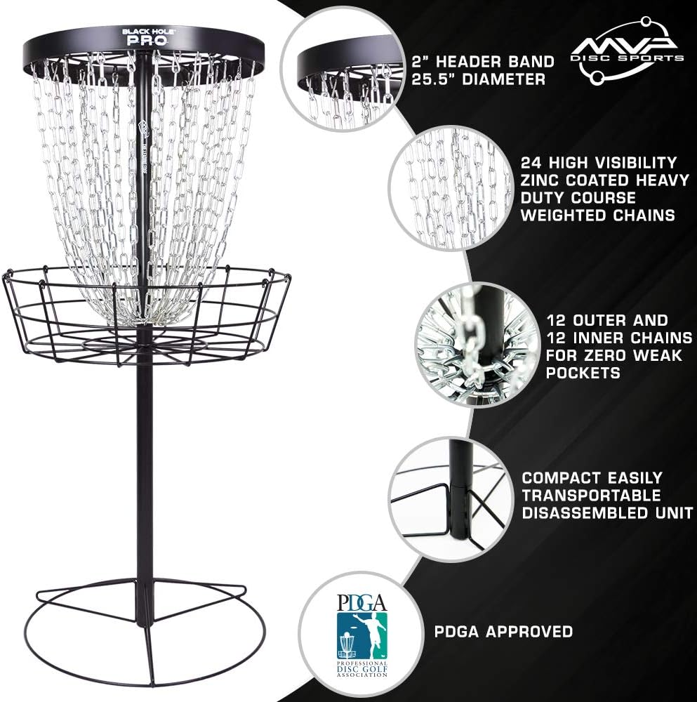 ENGINEERED FOR EASY ASSEMBLY – the Black Hole Pro disc golf basket includes 6 pieces (base, lower pole, cage, upper pole, chain rack, and top cap) with detailed instructions for exceptionally quick setup or disassembly, allowing you to spend less time on setup and more time on enjoyment. Assembles in under one minute!