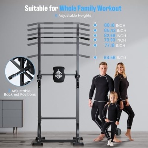 【Best Exercise Experience】The pull-up bar has 6 levels of height adjustment, which can be easily adjusted between 64.56″-88.18″. When the exerciser dips, the backrest has 7 adjustable holes (1.2″-6.7″ ), providing the best exercise experience for different exercisers, and all family members can participate.