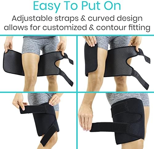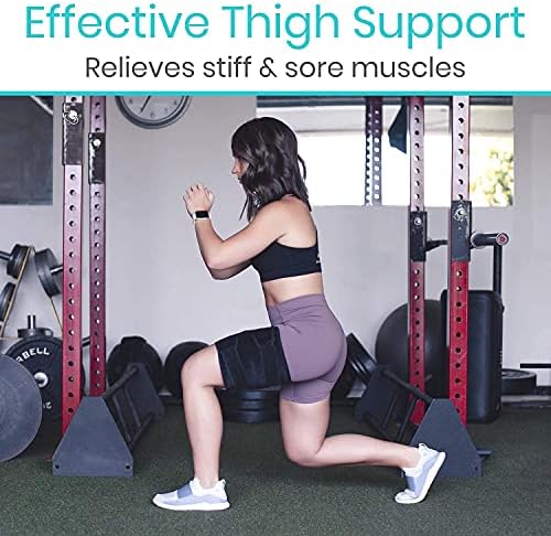 RELIEVES STIFF AND SORE MUSCLES: Increasing circulation and retaining therapeutic heat, the compression support wrap relieves stiff and sore thigh muscles. Effective for groin, hamstring and quad strains and pulls, the thigh support brace promotes healing, reduces recovery time and is useful in preventing re-injury.