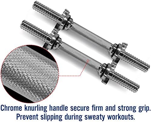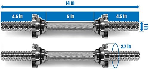 Well made construction lasts a lifetimeyes4all dumbbell handle is a must-have item for any fitness addicts to add into your collection. Constructed of high quality steel, our dumbbell handle is strong and sturdy enough to prevent it from bending or breaking under constant usage. In addition, the handle is covered with textured chrome coating finish to provide a firm, secure and non-slip grip even with sweaty hands. Universal design fits all 1-inch-hole weight platesour adjustable dumbbell handles have 1-inch diameter sleeves and therefore are only compatible with regular pancake plates with 1-inch diameter center holes. Fully equipped with star-lock collars threaded star-lock collar with loose-resistant rubber trim design provides safe and easy plate changes. Only take seconds for you to affix and slide off weight plates during your workout! Product specificationsset of 2 dumbbell handlesdimensions: 14 inch length x 1 inch diametermaterial: high quality steel with chrome coating finish5-inch knurled handle for a non-slip gripthreaded star-lock collar with loose-resistant rubber trimsbest warranty: 5 year satisfaction and 60 day free return.