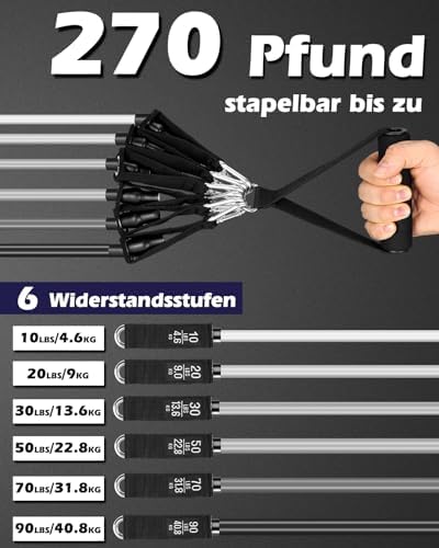 [Maximum Resistance 270lbs] – Our resistance bands are color-coded with 6 different resistance levels 💪 (10 lbs, 20 lbs, 30 lbs, 50 lbs, 70 lbs, 90 lbs) to suit a wide range of fitness levels, from beginners to professionals. Seamlessly adjust resistance from 10 lbs to a challenging 💪 270 lbs by using them individually or in combination.